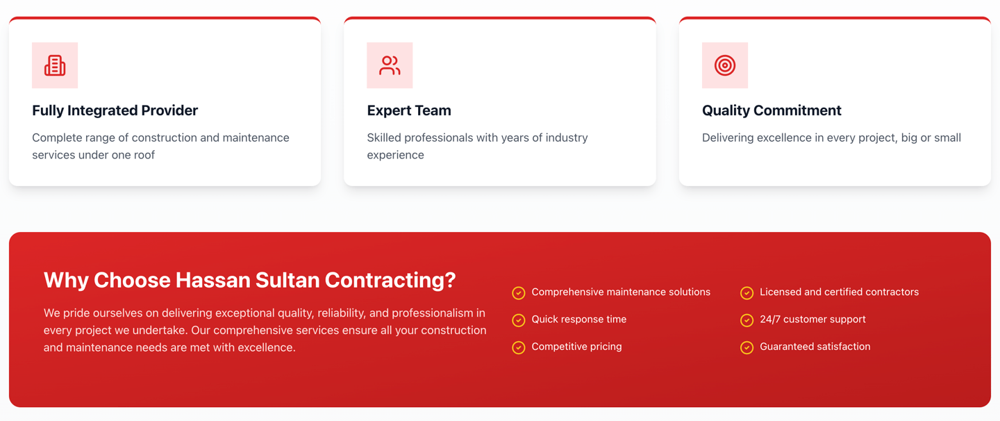 Hassan Sultan Contracting & General Maintenance Company, established in 2007 and headquartered in Abu Dhabi, stands as a fully integrated service provider delivering comprehensive solutions under a single point of contact. Over the years, we have earned the trust of some of the most prestigious clients across the UAE by consistently offering reliable, efficient, and quality-driven services. Our strength lies in our ability to understand and adapt to the evolving market needs within the UAE. Every member of our team is committed to maintaining the highest standards of professionalism, innovation, and customer satisfaction. This dedication ensures we deliver solutions that are not only effective but also aligned with the dynamic requirements of our clients